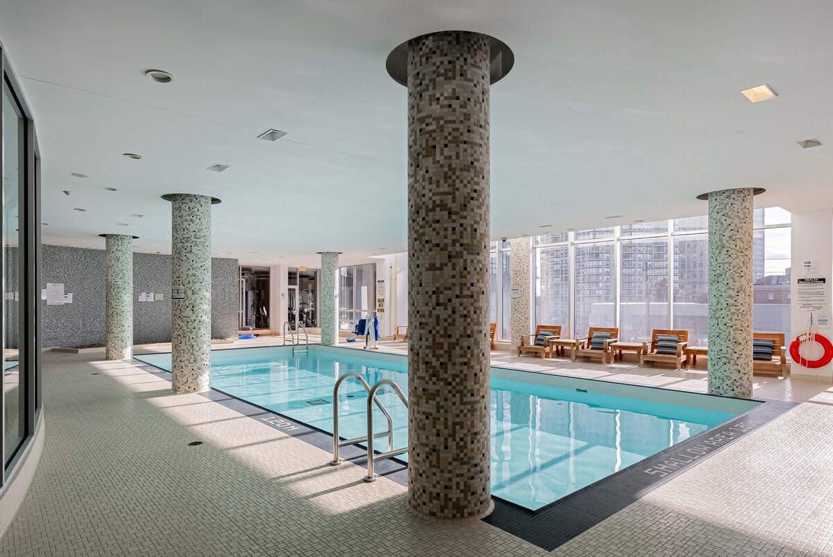 Hermoso y céntrico condominio para tu comodidad. Disfruta de la piscina, el jacuzzi, el sauna, el gimnasio y el estacionamiento GRATUITO en las instalaciones. Cocina totalmente equipada, lavadora, secadora y wifi de alta velocidad. Duerme cómodamente 4 personas. Las ventanas del piso al techo en la sala de estar y el balcón te ofrecen hermosas vistas de la línea del cielo de la ciudad, la Torre CN y el lago Ontario. A poca distancia a pie de la costa, restaurantes, clubes nocturnos, tiendas de comestibles. Perfecto para asistir a conciertos, conferencias, partidos de béisbol y hockey.
