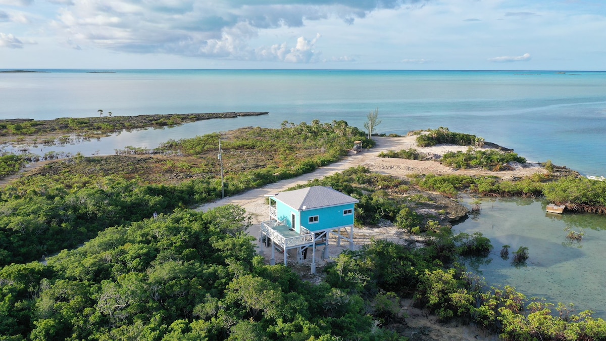 Esta nueva casa de campo frente al mar tiene un agujero azul de 100 pies en el patio trasero y tiene vistas a un banco de peces de primera clase donde puedes verlos desde el balcón. Construida sobre pilotes, disfruta de los innumerables tonos de azul de Exuma desde todas las habitaciones y ¡no pierdas de vista a las tortugas en la laguna! Con 1 dormitorio y 1 baño, pueden dormir cómodamente 4 personas utilizando el sofá cama en el salón. Lanza el kayak o la tabla de remo directamente desde el patio trasero y disfruta de las aguas de Exuma.