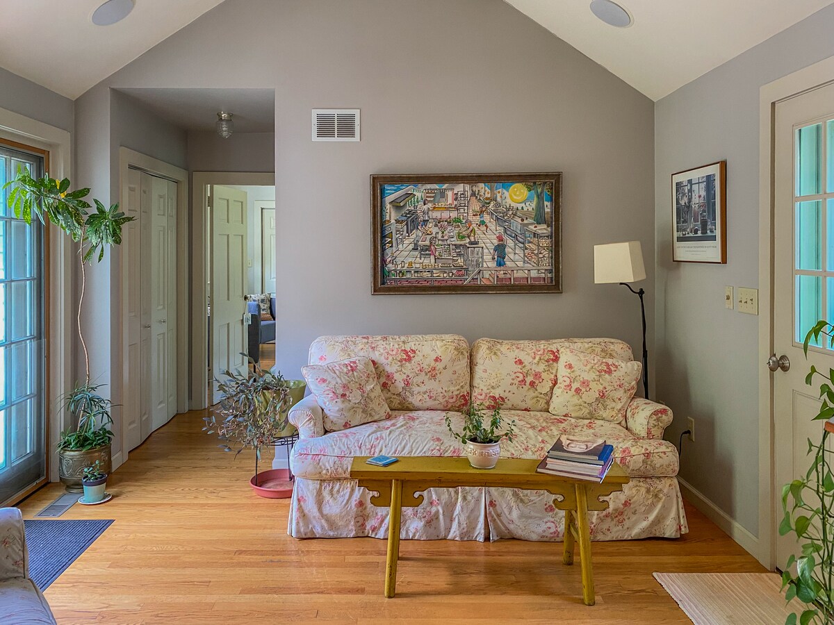 Bright room, 2nd floor queen bed, cotton sheets, own bathroom, sitting area, sleep sofa, and deck. We bring a breakfast to your door to start your day right - because it’s not just AirB! Private and close to where you want to be: four minutes' drive to Deerfield Academy, Eaglebrook or Bement, 17 miles to Northampton and Amherst and their colleges. If you like a secluded spot, you will be happy here with us and we will respect your privacy. The entrance is the only shared space.