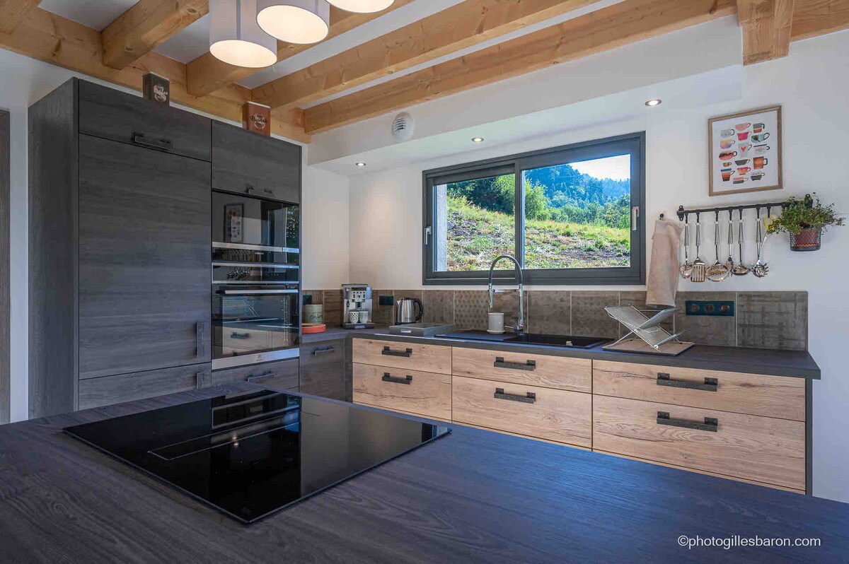 El chalet ofrece vistas panorámicas a las cumbres desde todos los lados. Además de la sala de estar, cuyos ventanales dan la impresión de vivir en el paisaje, la planta superior ofrece 3 dormitorios (2 cerrados) y un baño, todos con grandes aberturas para multiplicar los puntos de vista. El diseño interior, una mezcla de autenticidad y modernidad, adopta el estilo chalet como hilo conductor, en armonía con la madera dominante, dejada al natural. La elección de los colores y materiales asegura un ambiente acogedor.