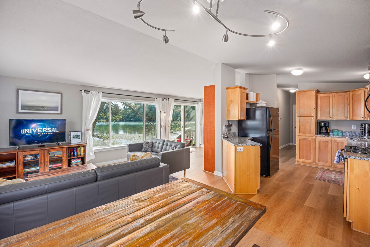 Esta casa de campo de dos dormitorios está a solo una milla de la ciudad de Friday Harbor, pero ofrece una manera perfecta de escapar de todo con un exuberante patio trasero que da a la bahía con increíbles vistas de Jackson Beach. Con marea baja, puedes bajar del malecón de la propiedad y caminar para explorar a tu antojo. Cuando termines con tu día, el sonido del agua corriendo suavemente afuera te adormecerá. La conexión a Internet de fibra permite que toda la familia trabaje o estudie a distancia.