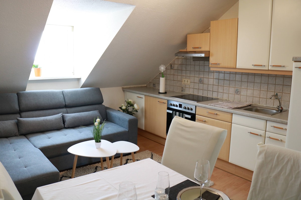 Sie wohnen bei uns im ersten Stock unseres Haus. Sie haben den gleichen Eingang wie wir, aber jede Wohnung hat dann eine verschließbare Wohnungstür. Die Ferienwohnung ( 103 m²) ist voll möbliert und hat einen wunderschönen überdachten Balkon. In der Ferienwohnung befinden sich 2 Schlafzimmer, Wohnküche, Wohnzimmer, Badezimmer und Toilette. Es gibt für Sie auch 2 bis 3 Parkplätze direkt neben dem Haus.