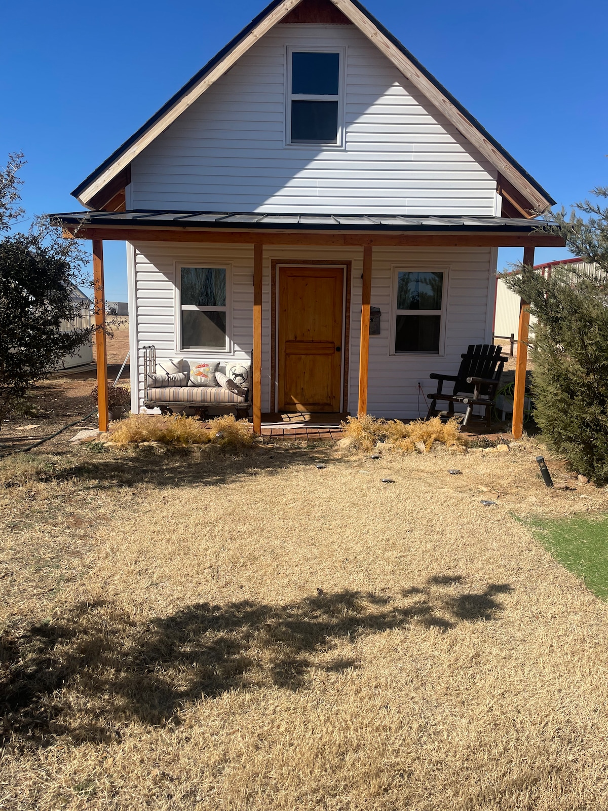 Private detached guest space, w/ private entry attached to our shop, and is the only AirBnb on our 5 acre property. The property is located 5 miles south of Seminole. We are 1 mile west of Hwy 385. The 215 sq ft space has one room with a queen-sized bed, and a private bathroom with a 5 function panel shower. There is a microwave, Keurig coffee maker, and mini fridge; we've included water & snacks. You'll find a peaceful patio seating area & parking outside of the private entry.