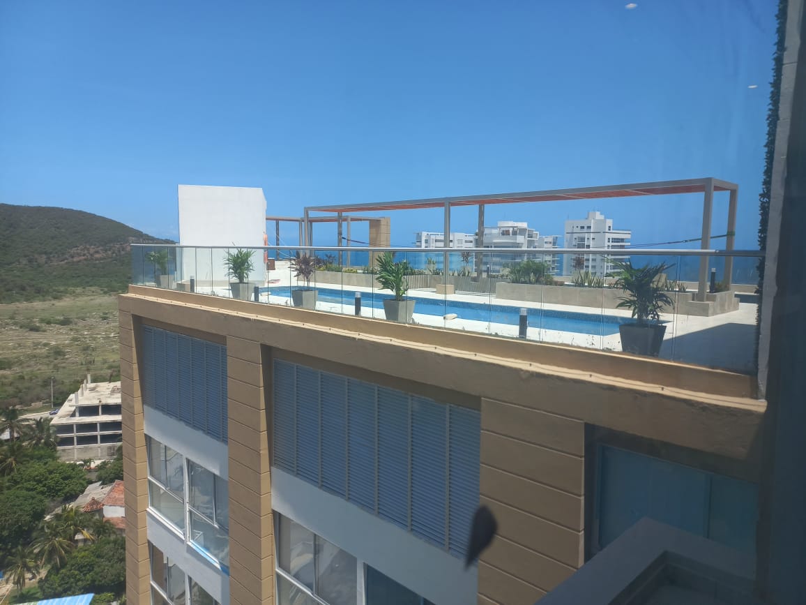 Apartasuite en arriendo para estrenar completamente amoblada y dotada, en el exclusivo sector de Playa Salguero, a 200 metros de la playa. Cuenta con cocina, sala comedor, habitación principal y un baño. Cuenta con una cama doble abatible adicional. El edificio cuenta con piscinas para adultos y niños, baños turcos, saunas, jacuzzis; terrazas con asoleadoras, parque infantil, gimnasio, salón de juegos, sky bar, spa, restaurante, y parqueadero totalmente gratis. Se admiten mascotas.