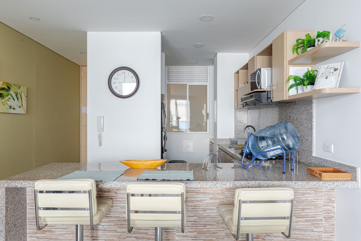 Apartamento moderno y tranquilo con vista al Mar Caribe, 1 habitación con cama doble, AA, TV Smart y baño con ducha de agua caliente. Sofa cama doble con vista al balcón, con AA, TV Smart y segundo baño con ducha. Internet fibra óptica alta velocidad, sala, comedor, escritorio, cocina, lavadora, parqueadero cubierto, ascensores, vigilancia 24 horas. Salida directa a la playa. A pie de gran variedad de excelentes restaurantes, supermercados, almacenes, agencias de viajes, bancos y vida nocturna.