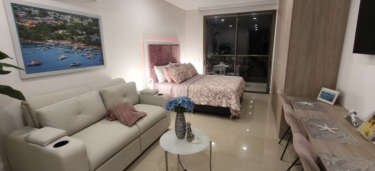 Escápate a esta suite de lujo en Santa Marta, a solo pasos de la playa Salguero Perfecta para parejas, familias o amigos: duermen cómodos 1 a 4 personas. Todo nuevo: diseño moderno, cocina full equipada, entrada con código (sin llaves), aire acondicionado, balcón con vista, TV 58” y cama extra doble + sofá cama. Seguridad privada 24/7, 2 piscinas, 4 jacuzzis, terraza, gym, ping pong, billar, coworking, lobby enorme . A 15 minutos del aeropuerto y Mall Arrecife, supermercados y restaurantes.