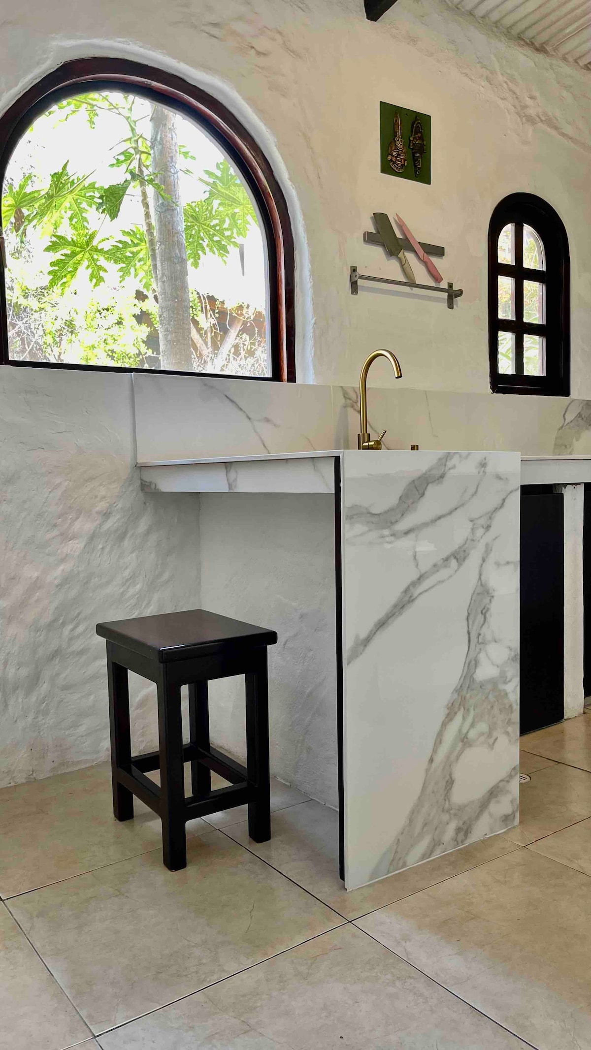 Aquí el tiempo baja el ritmo. La piedra chuleta, lava volcánica de Galápagos, se combina con madera natural, arcos suaves y luz cálida para crear un espacio sereno y acogedor. Un refugio íntimo para dos, pensado para descansar, leer, cocinar sin prisa y habitar la calma.