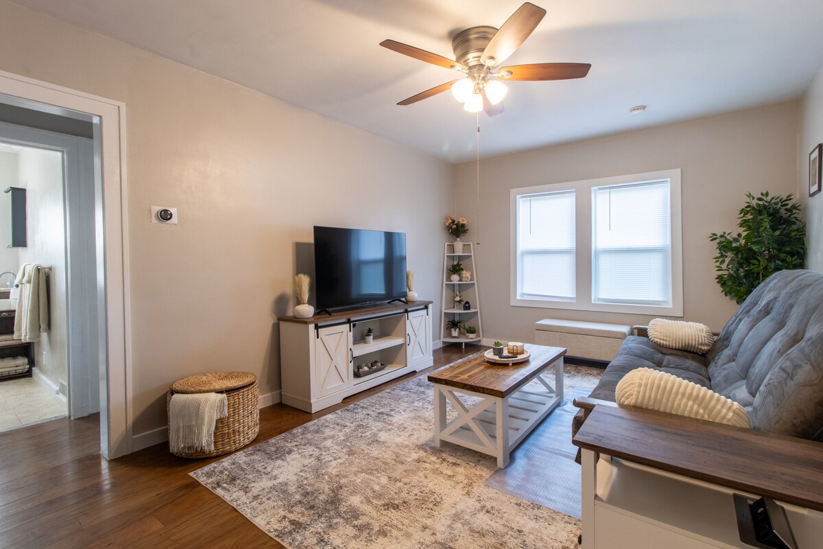 Bienvenido a Oak Haven, un refugio cálido con detalles de madera y un encanto acogedor. Esta acogedora casa de 2 dormitorios incluye un lujoso futón que se despliega en una tercera cómoda cama tamaño queen. Con 860 pies cuadrados, está cuidadosamente diseñado y tiene todo lo que necesitas, solo que en un espacio más pequeño e íntimo. Es el lugar perfecto para relajarse después de un día en la ciudad, con cómodas camas, una cocina bien equipada y una cálida sensación de cabaña que te hace sentir como en casa.