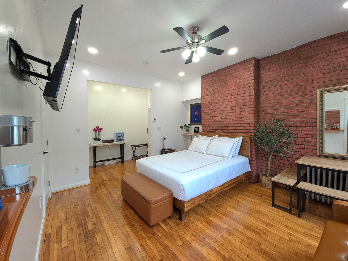 Disfruta del ambiente tranquilo y elegante de este apartamento tipo estudio recién reformado en South Slope, al sur de Park Slope. Una cama tamaño queen y un sofá cama, con capacidad para cuatro (4) personas. La unidad está totalmente equipada con comodidades modernas como TV inteligente, sistema de aire acondicionado dividido, lavadora/secadora y una cocina elegante. El encantador diseño del apartamento cuenta con paredes de ladrillo visto, techos altos y un barrio que complementa perfectamente el espacio, evocando la esencia del viejo Brooklyn.