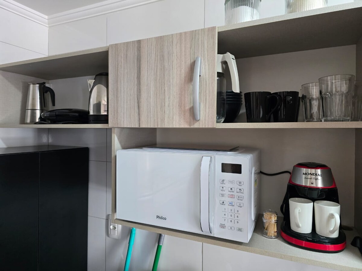Estudio supercéntrico en el piso 17 de un edificio nuevo con gimnasio, terraza y minimercado. Estacionamiento privado, aire acondicionado, cocina completa, lavadora, ropa de cama, colchón Castor, almohadas, cobijas y toallas. Internet privado de 360 Mb con un excelente espacio de oficina en casa, que incluye un escritorio grande y una silla ergonómica. Muy tranquilo y seguro. Puntos de interés cercanos: Fleming Medicine a 550 m, Atitus a 700 m, FGV a 450 m. Restaurantes, farmacias y mercados a pocos metros.