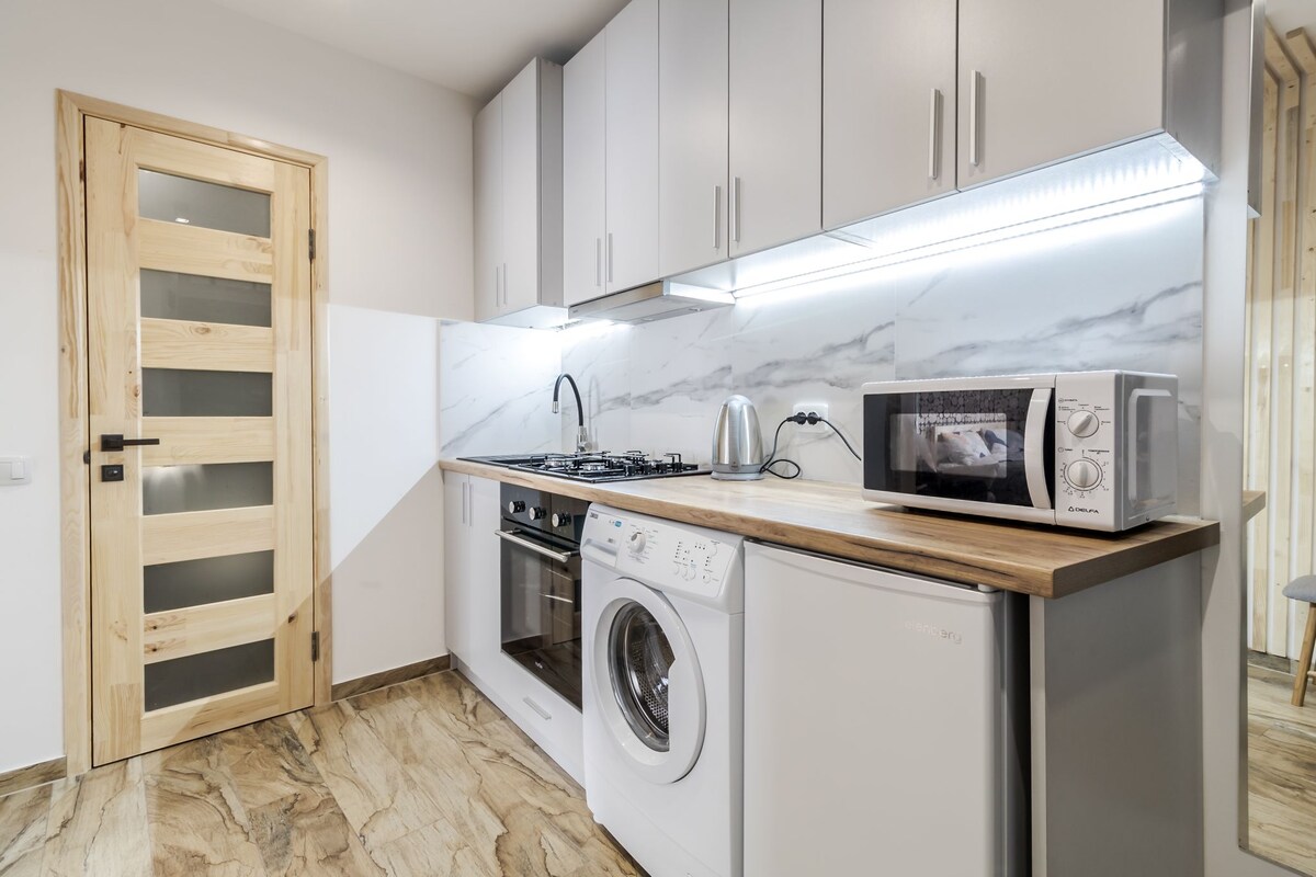 El apartamento está en el centro histórico de la ciudad y hasta 3 personas pueden encontrar un lugar en él. Los equipos de cocina son MW, cocina de inducción, hervidor eléctrico, lavadora, calentador de agua eléctrico, nevera, té, café, azúcar, sal y pimienta, filtro para agua potable. Los huéspedes pueden utilizar wifi gratuito, televisión LED, secador de pelo, plancha, tabla de planchar, ventilador de la habitación con reloj de temporizador y tres posiciones en energía. Los huéspedes reciben juegos desechables: pasta de dientes y cepillo de dientes de dientes, geles de ducha y champús, jabón.