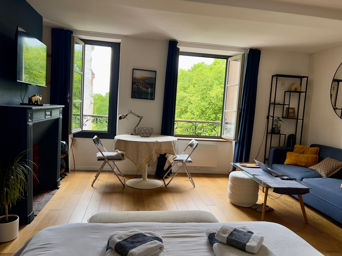 ¡En el centro de Pau, frente a los jardines del castillo, simplemente deje su maleta y disfrute de la ciudad! Deje su coche durante su estancia, garaje cerrado en la planta baja, estación de carga de vehículos eléctricos de 22 kW, Tipo 2, Freshmile. Paradas de autobús y muchos restaurantes a 500 metros, Boulevard des Pyrénées a 600 metros, campo de golf a 1,3 km. Apartamento dúplex con aire acondicionado de 53 m² con capacidad para 4 personas y terraza ajardinada equipada.