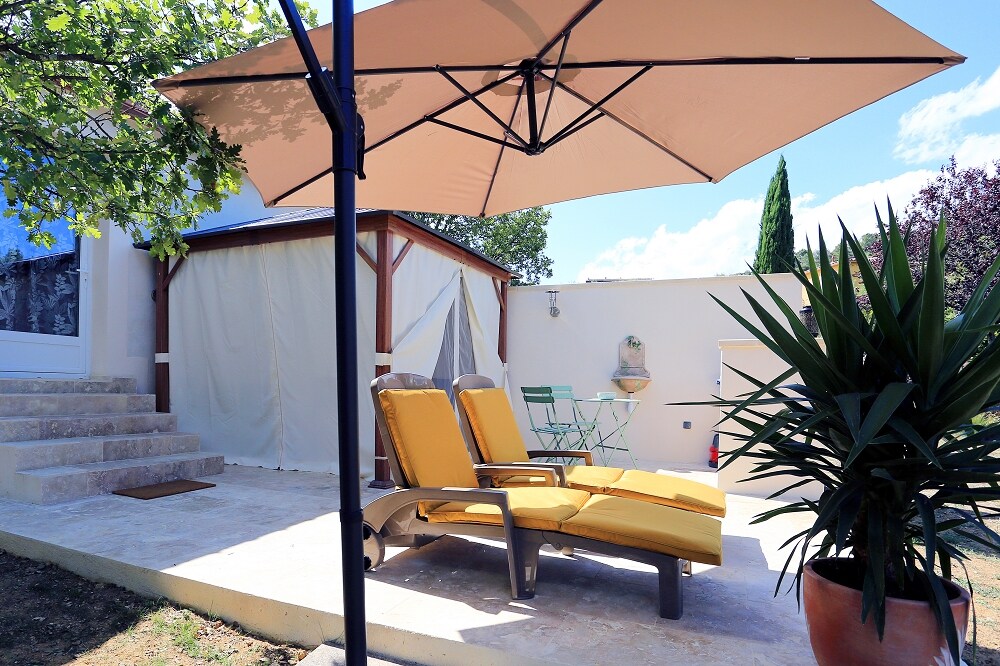 Apartamento nuevo independiente, que consta de una sala de estar con cocina equipada, dormitorio y cuarto de baño con ducha italiana. Acceso a la terraza privada con salón y mesa de jardín. Acceso al SPA, de abril a octubre POR UN SUPLEMENTO DE 30E/DÍAS. El sofá es un lugar adecuado para dormir para 2 personas más. Unas hermosas vistas que merecen la pena, a este pequeño paraíso se accede por un camino con un 30 % de desnivel accesible en vehículo ligero. Anduze y el río se encuentran a 10 minutos a pie.