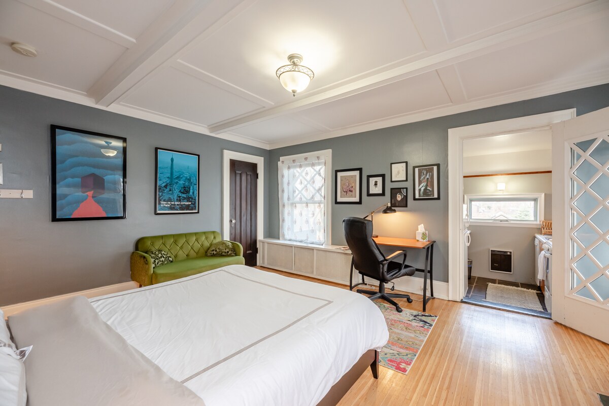 Decoración moderna con mucha luz natural. Esta casa es propiedad de un par de galeristas, por lo que el espacio está lleno de muchas obras de arte locales originales. Ubicado en el barrio de las artes de Rochester, este apartamento tipo estudio se encuentra a poca distancia a pie de muchos de los lugares de interés, restaurantes, museos y galerías de la ciudad. A poca distancia a pie Memorial Art Gallery - 2 minutos Hotel Strathallan - 2 minutos Auditorium Theatre - 7 minutos Museo George Eastman a 10 minutos. Escuela de Música Eastman a 15 minutos