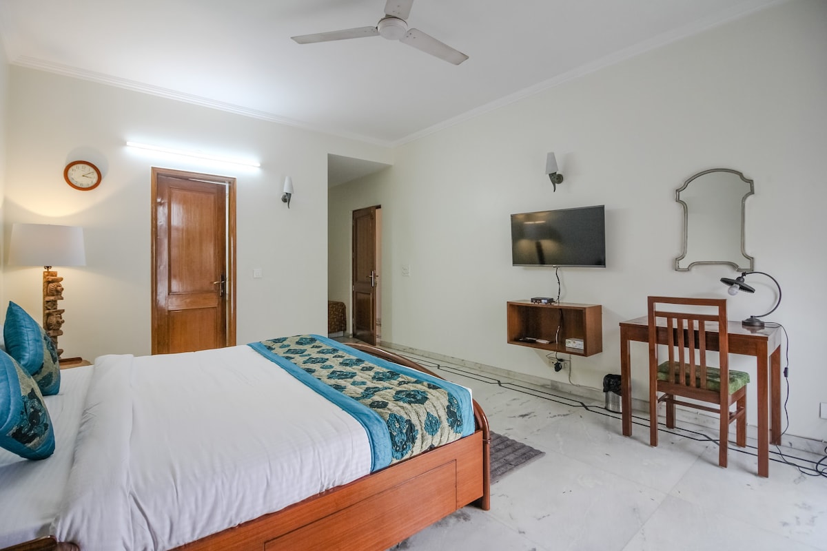 Llegada autónoma disponible Desayuno gratuito incluido Apartamento privado totalmente equipado con cocina en dos niveles con vistas a la terraza. Terraza privada y balcón rodeado de exuberante vegetación. Con una ubicación céntrica en un barrio histórico de Nueva Delhi. Piso privado dentro de una casa compartida con mi familia. Los espacios compartidos incluyen: lavandería (bajo petición) y gimnasio equipado con mancuernas y pesas. Wifi incluido. Tranquilo, bien iluminado y a poca distancia a pie de jardines, cafés y sitios patrimoniales.