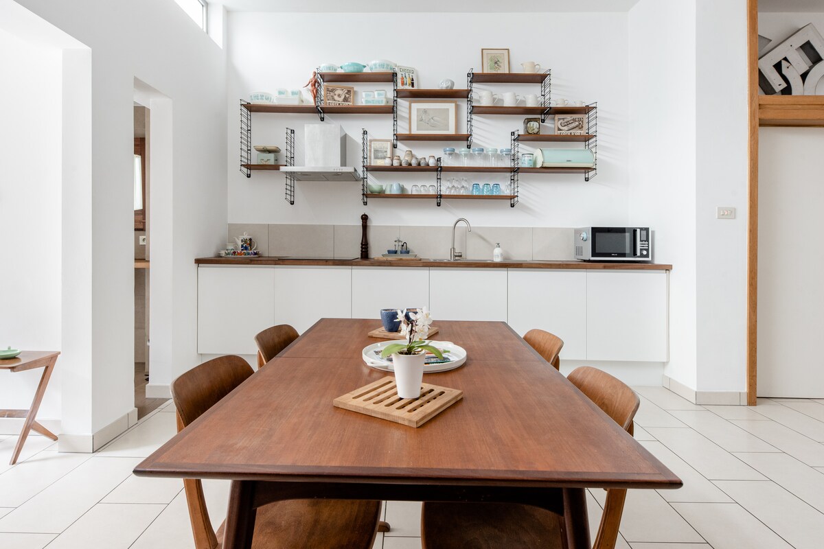 Explora el cercano museo del diseño y luego relájate en este espacioso alojamiento de planta abierta con vistas al jardín del patio. Los muebles de madera vintage crean un estilo de mediados de siglo y un ambiente cálido, mientras que la decoración en tonos blancos aporta frescura.