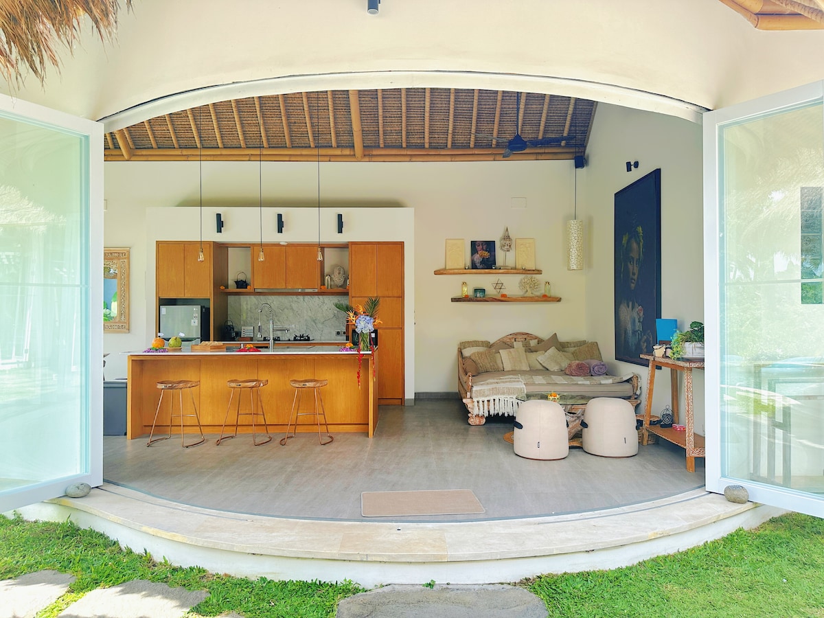 BARONG is a spacious furnished garden sanctuary in Penestanan, Ubud, ideal for monthly stays, remote work, or longer visits to Bali. Walking distance to Alchemy Yoga Center, cafés, and BGS, the home offers a peaceful setting surrounded by greenery while remaining close to Ubud Center. A suspended loft bedroom with large windows overlooks lush greenery, with a cozy daybed below. Enjoy a big open-air kitchen perfect for cooking, hammocks on the terrace, and a koi pond and fountain.