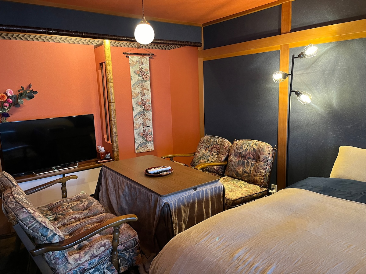 Iwata es una casa de dos pisos en Shimo Atago-cho, un área del centro de Gujo Hachiman. La entrada en el primer piso es un espacio de estacionamiento, por lo que es un lugar conveniente para dejar entrar y salir tu equipaje de inmediato. Esta es una casa adosada en una casa japonesa pura, y la abrimos como una simple renovación como casa de alquiler para ayudar a eliminar las vacantes y la falta de alojamiento. Iwata tiene capacidad para un grupo grande de hasta 8 personas. No dudes en alojarte con familias y grupos durante la temporada de Gujo Odori y la temporada de nieve de esquí de invierno. Puedes ir caminando al recinto de Gujo Odori.Durante la temporada de esquí, también hay un cómodo acceso a las áreas de Takasagi y Meijo, y se instala un calentador de secado. En el primer piso, relájate en la habitación de 6 tatami de estilo japonés como sala de estar. Hay una cocina comedor con un televisor montado en la pared en la parte trasera y hay platos y utensilios de cocina. Hay un baño, un inodoro y un baño en la parte trasera y un pequeño jardín. Arriba, hay dos camas dobles con habitaciones occidentales en la parte delantera. Cada 18 de agosto, se celebra en esta ciudad el "Jugu Kannon Festival" de Gujo Odori. ¡El segundo piso es un asiento premium donde puedes escuchar Otako de cerca! Hay una habitación de estilo japonés con 6 tapetes de tatami entre el centro y la parte trasera, lo que la convierte en un dormitorio.