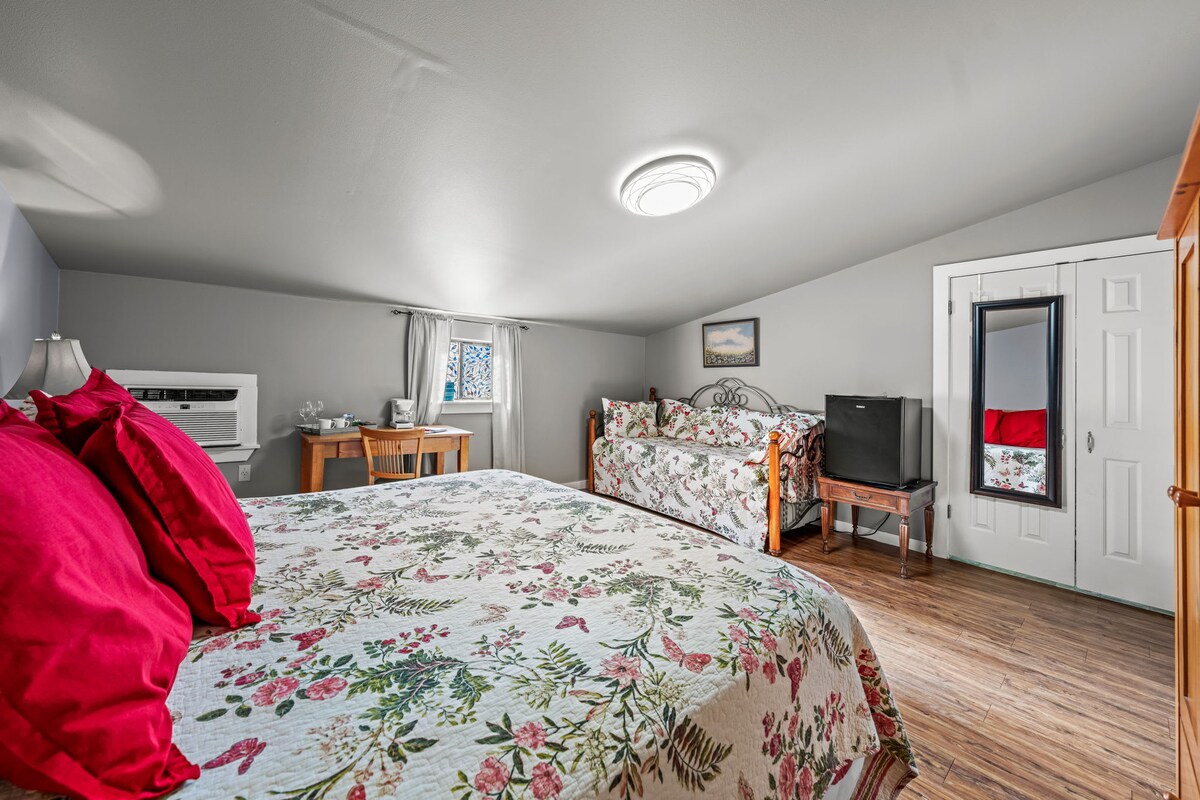 The Texas Wildflower room at Full Moon Inn, across from Luckenbach, TX, offers a spacious king bed, private ADA-compliant bath with tub/shower, plus a twin daybed with trundle for 2 extra guests. Enjoy a FREE delicious HOT BREAKFAST and BOTTOMLESS MIMOSAS served daily in the dining room / bar area. Perfect for families or groups seeking comfort and accessibility in a peaceful Texas setting.