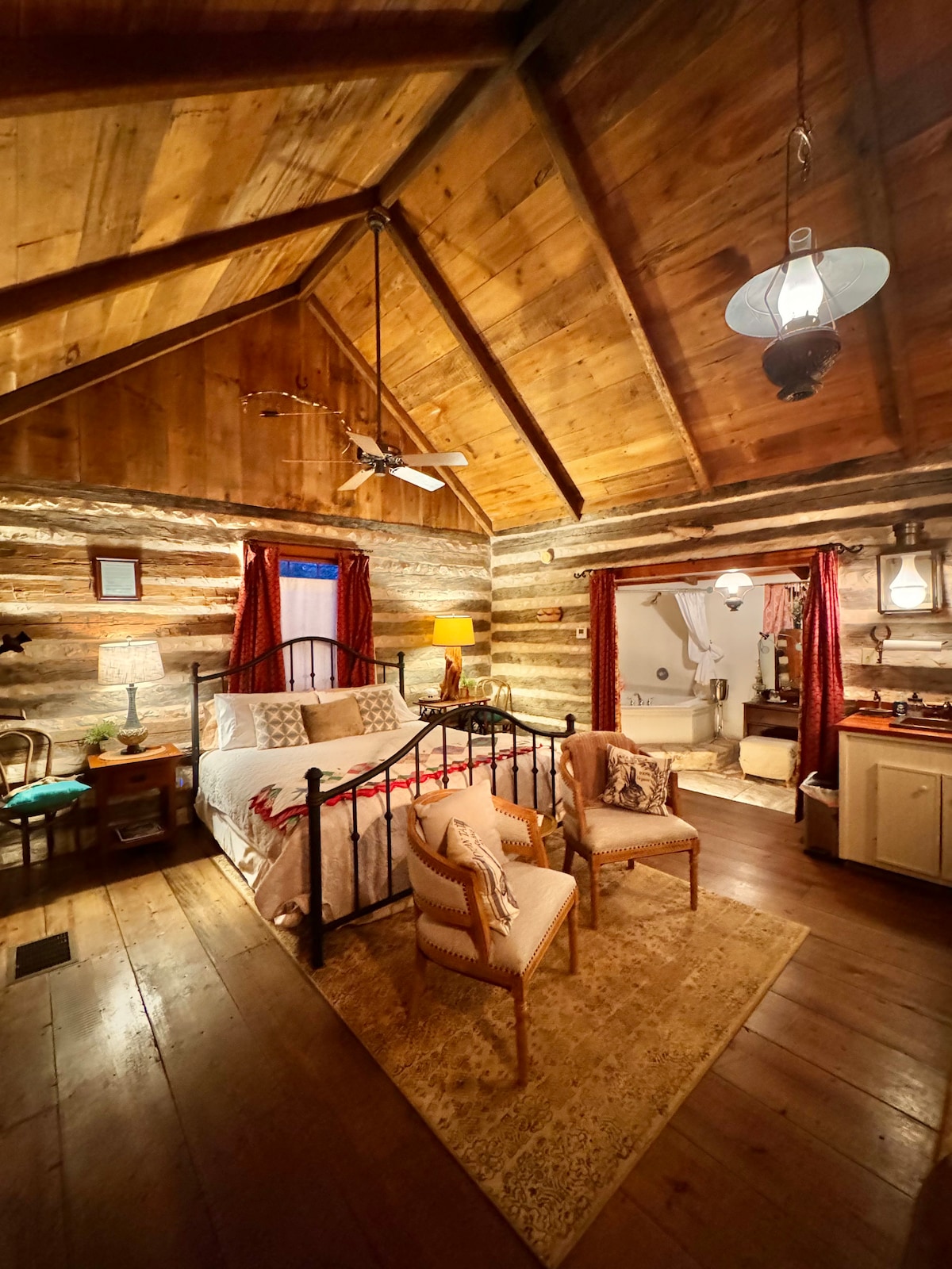 Historic 1880's Log Cabin decorated with period correct antiques. The cabin has wooden floors, exposed beams and natural rock fireplace with ambience insert. 1 bedroom/ 1 bath, (.5 miles) walking distance to our historic Downtown! King Bed in a large open bedroom. Indoor Whirlpool Tub For Two. Kitchenette with Mini Fridge, Microwave and Coffee Maker (No Stove) Television with Complimentary WiFi No Daily Housekeeping Coffee (Keurig) and water provided. No Smoking, Children or Pets Please.