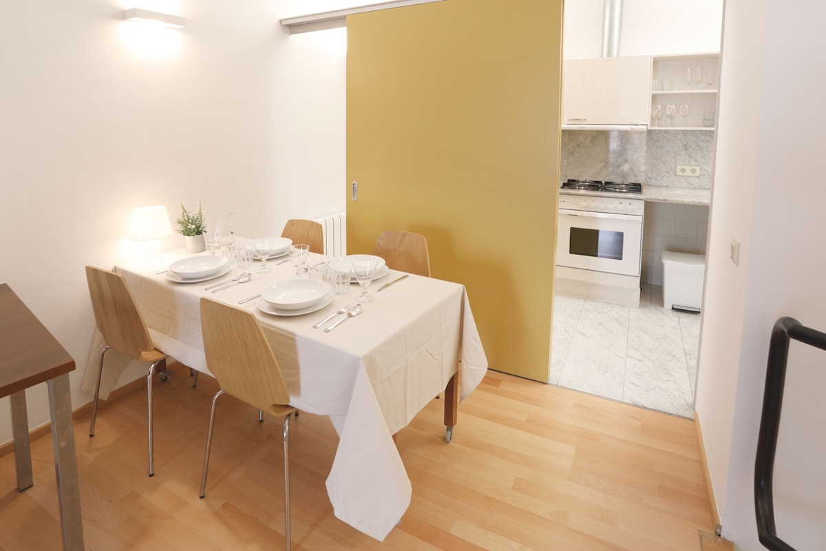 Apartamento acogedor y muy bien situado en el centro del casco antiguo de Girona. Ático loft con una cama de matrimonio, un sofá (convertible en sofá-cama) y una cocina abierta al comedor. Baño confortable con ducha. Equipado con ascensor, aire acondicionado, calefacción eléctrica, lavadora, cafetera, hervidor de agua, exprimidor, tostadora, secador de pelo, TV.