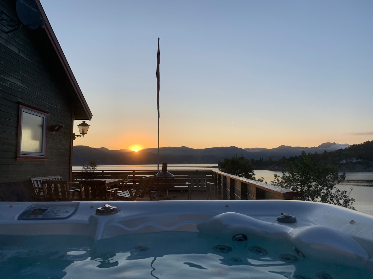 Casa de campo espaciosa con gran terraza y vistas increíbles. Distancia a pie a la playa, el agua y las zonas de senderismo. A solo 10 minutos en auto del centro de Hommersåk. Durante el verano se puede pasar todo el día en la terraza con grupo de comedor, grupo de sofás, tumbonas, barbacoa, jacuzzi y fogata. Si llueve un poco, puedes acurrucarte en el sillón debajo de un techo de cristal y una lámpara de calor. En invierno puedes disfrutar frente a la chimenea en la sala de estar o descender al jacuzzi y disfrutar de la vista del mar y las montañas.
