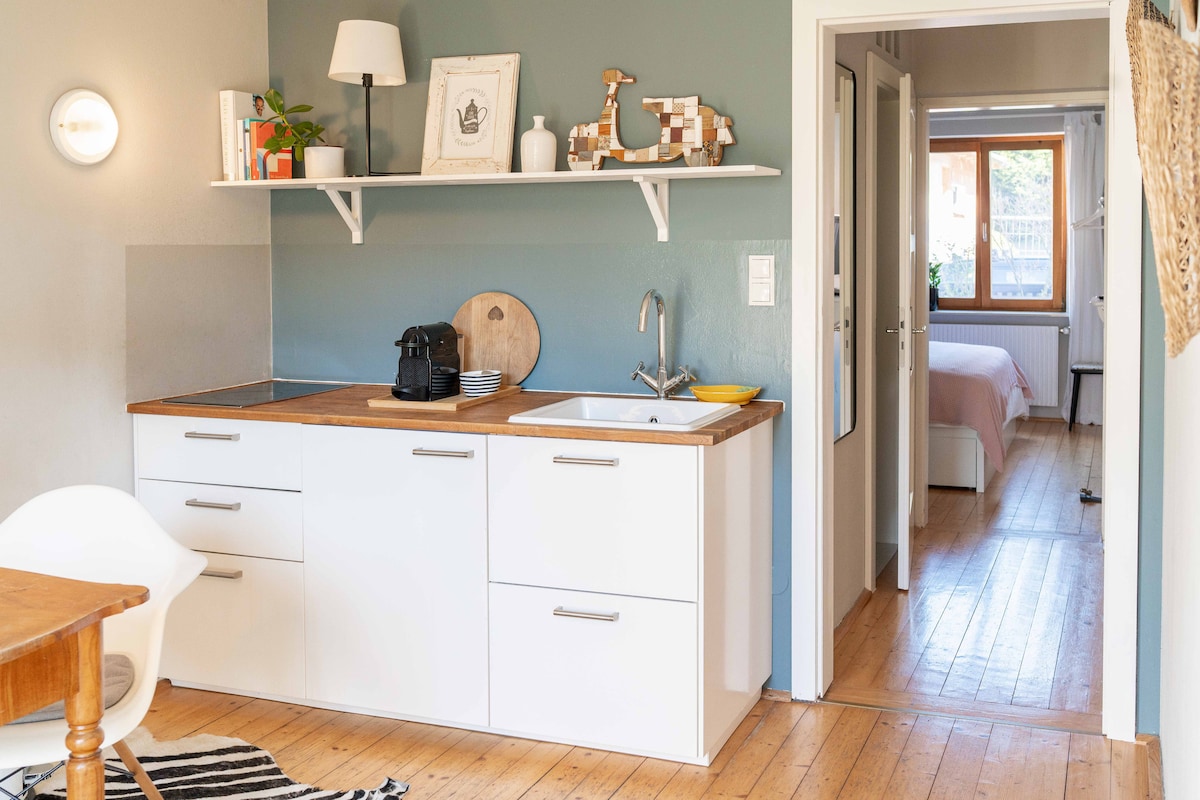 Un pequeño y romántico apartamento en una casa histórica de más de 260 años al pie de la montaña de Untersberg. El pasillo central conecta el salón, la cocina abierta, el baño y un pequeño despacho con un sofá cama. A través de la sala de estar se accede al dormitorio, que está equipado con una cama doble. Una estufa de leña en la sala de estar garantiza noches acogedoras. Un pequeño jardín delantero con juego de comedor te invita a relajarte.