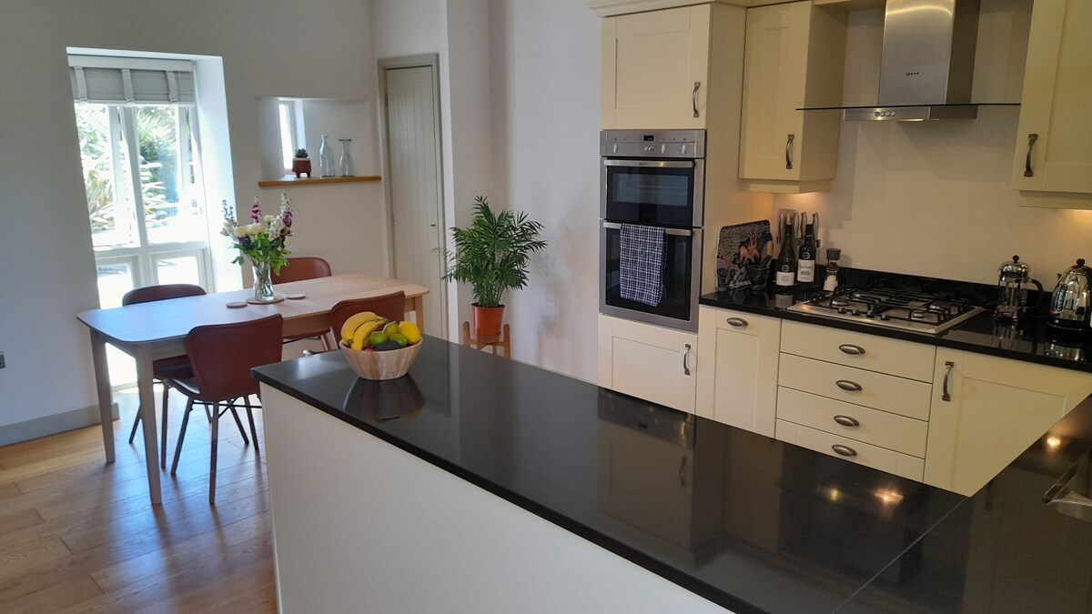 Hermosa casa de invitados reformada con cariño en el corazón del pueblo de Pilton, situada en los exuberantes terrenos privados de nuestra casa familiar. Dos dormitorios dobles, uno con bañera independiente con tapa enrollable (opción de añadir una cama supletoria/cuna para un niño); cuarto de ducha; gran cocina de planta abierta, comedor y sala de estar, con dos juegos de puertas dobles que conducen a una terraza comedor privada al aire libre (con barbacoa y chimenea); vista y uso compartido de nuestro prado con columpio de cuerda, columpio para bebés y trampolín para niños.