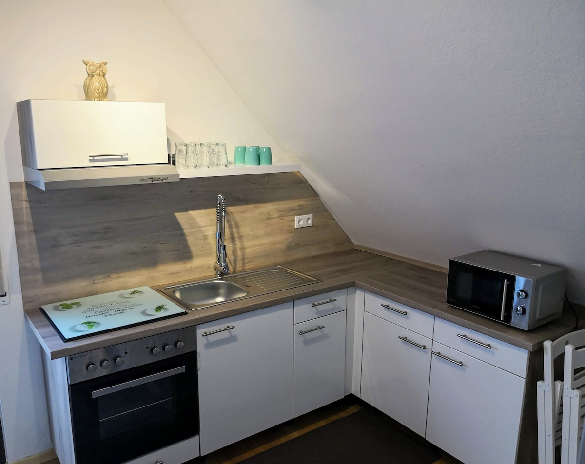 Unsere neue eingerichtete und geräumige Ferienwohnung mit separatem Eingang verfügt über eine Küche, Diele, Bad, Schlafzimmer mit Doppelbett sowie ein Wohnzimmer mit Couch und einem weiteren Einzelbett. Zusätzlich ist die Dauerschläfercouch als Bett nutzbar. Das moderne Bad bietet weiterhin eine Dusche. In der Küche finden Sie einen Herd mit Cerankochfeldern sowie einem Backofen mit Umluft und eine separate Mikrowelle. Sitzgelegenheit draussen auf dem Balkon zum frühstücken oder grillen.