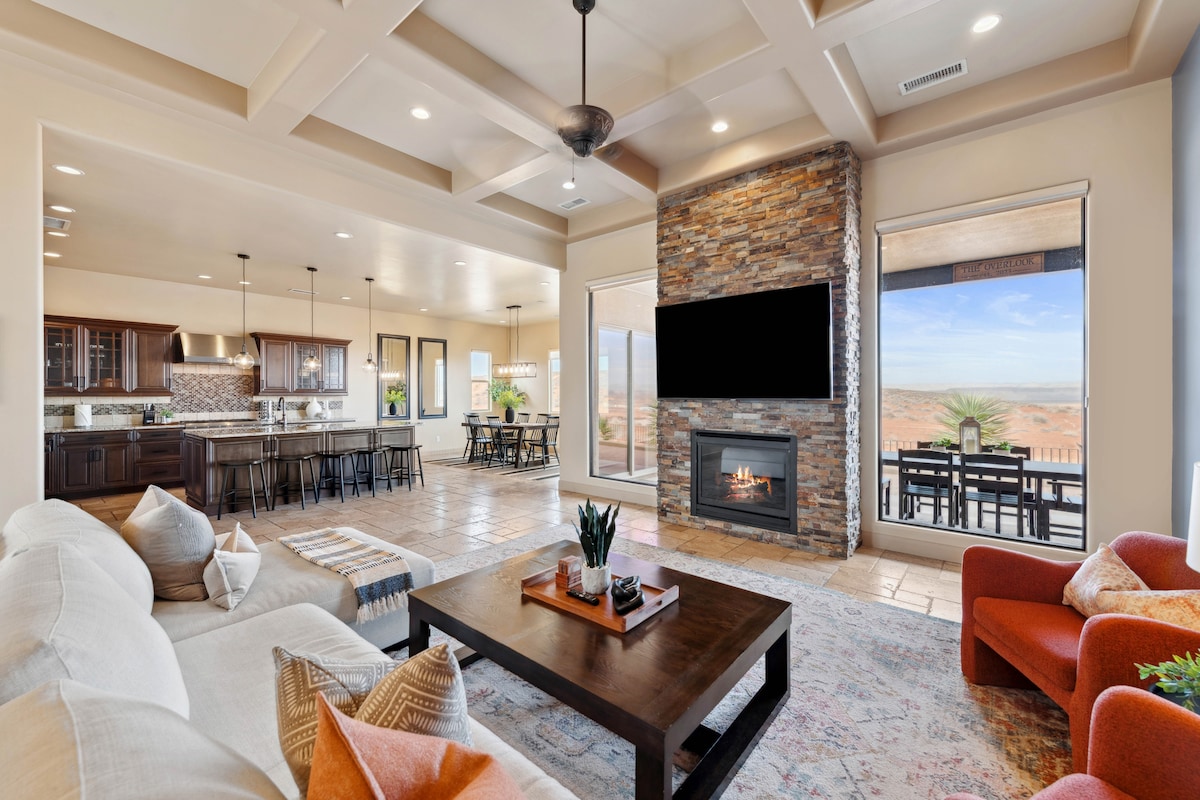 Disfruta de impresionantes vistas todo el día desde este espacio amplio, abierto y moderno. Con techos de 20 pies y ventanas de pared a pared, disfruta de la belleza natural de la zona desde la comodidad de tu hogar. 3 dormitorios grandes y 2 baños divididos en 2 plantas con 2 camas adicionales. Horseshoe Bend está a 5 minutos y Antelope Canyon y Lake Powell están a 10 minutos. Barbacoa, cena o contempla las estrellas desde el patio trasero y la terraza superior, siéntate alrededor de la hoguera, disfruta de un juego de tejo, futbolín, dardos o baloncesto de arcade, 5 televisores, wifi rápido, lavandería.