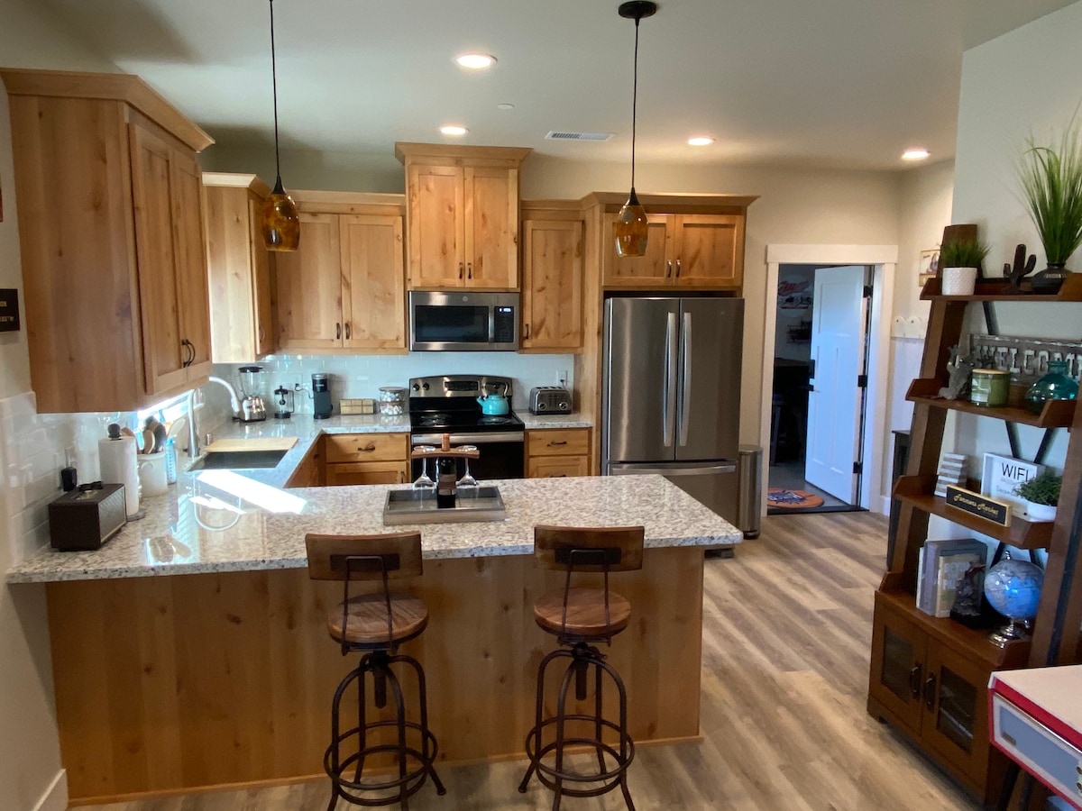 Brand new home in a quiet and nice neighborhood. This home has many custom features throughout with all brand new furniture and bedding. One bedroom has a queen bed with 55" TV. the other bedroom has a double bed with a 55" TV. This house has a large custom kitchen with granite counters and all stainless steel appliances. The garage has polished concrete floors with a 70" TV along with arcade games and a beverage fridge.