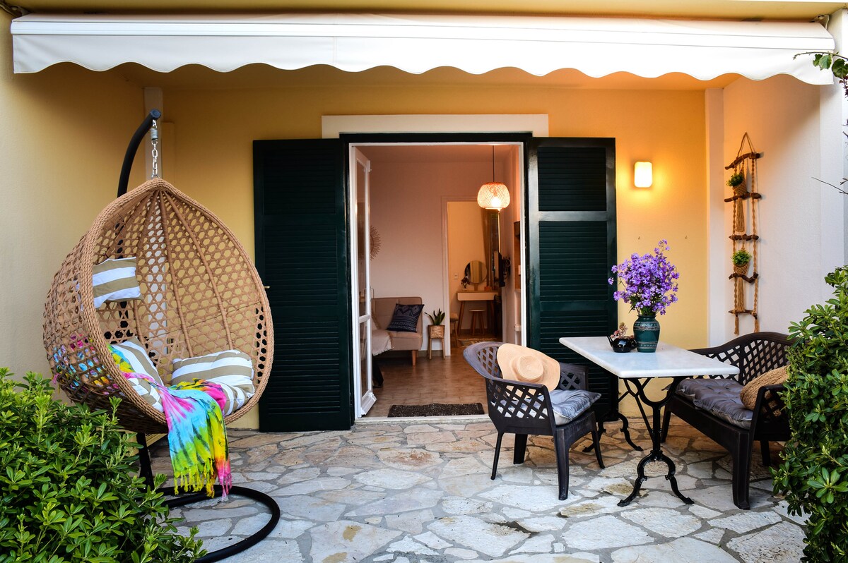 A cozy Beach house with garden, situated in Glyfada beach only few steps from the beachfront, inside Menigos Resort complex. Relax on your hammock, enjoy wonderful sea-view from the garden on a beloved- must see location of Corfu, surrounded by green hills.