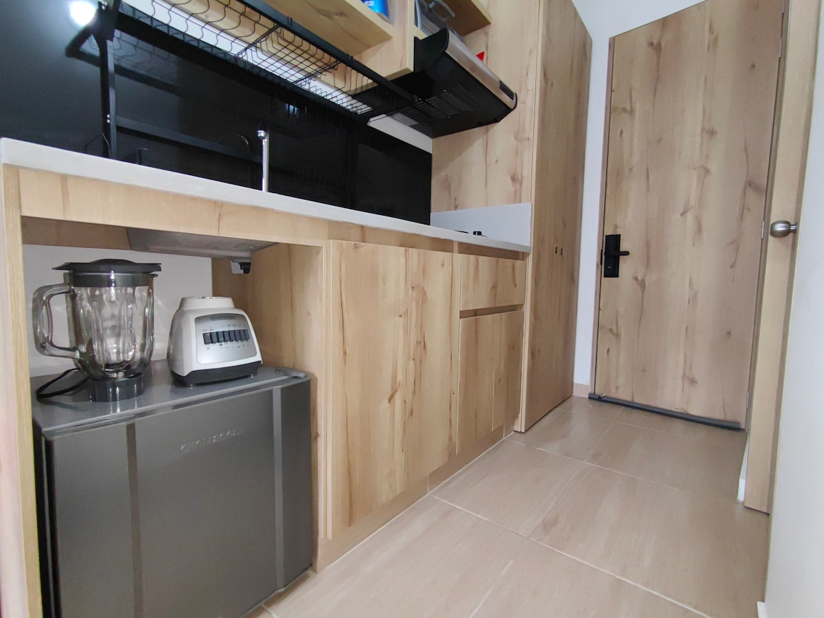 Acogedor apartamento, el cual cuenta con cama doble, televisor, escritorio, sofá, armario, baño privado y cocina con todos los implementos y electrodomesticos necesarios para uso del huésped, todo nuevo. El conjunto esta ubicado en una zona muy central, cerca del centro historico e internacional, donde se encuentran los mayores atractivos de Bogotá. Con vias de facil acceso y sistemas de trasporte publico que conectan el centro con el aeropuerto y la terminal de transporte.
