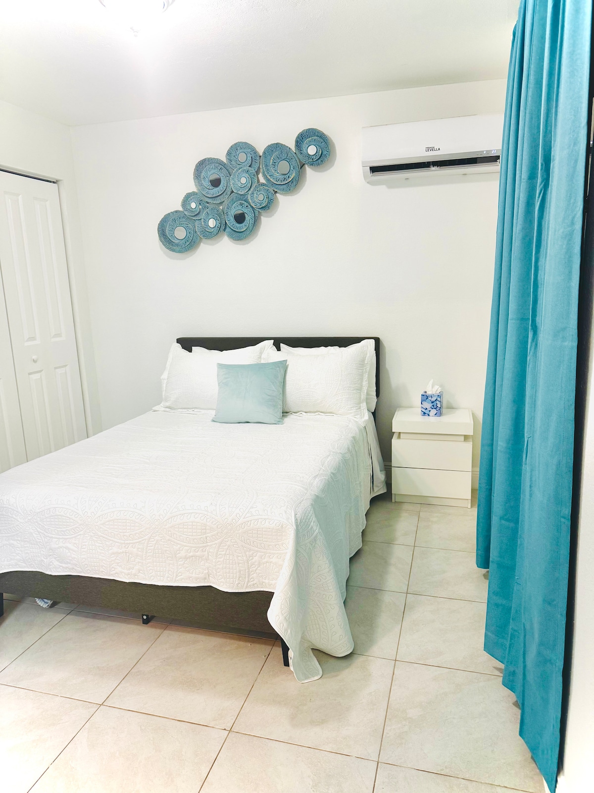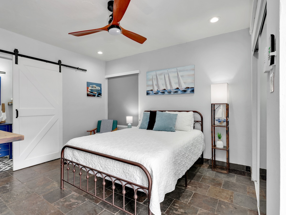 Este moderno refugio costero es un apartamento tipo estudio completo con entrada directa y privada: Zona de estar exterior privada con sombrilla. Televisor inteligente con Netflix, Amazon TV, Disney+ Cama tamaño queen con colchón de lujo. Cómoda y armario. Espacio de trabajo con carga inalámbrica. Ducha de mármol a ras de suelo con tocador completo. Incluye artículos de aseo. Cocina pequeña con nevera y congelador. Keurig con café de cortesía Cocina de inducción Microondas Horno tostador/freidora de aire Lavadora/secadora Toallas de playa, sillas y sombrilla Estacionamiento para un auto.