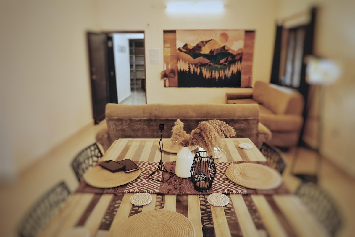 Bienvenido a "OASIS", tu escapada serena organizada por Shashi. Este vibrante refugio de 4 dormitorios se encuentra en una exuberante vegetación, que ofrece una escapada tranquila del ajetreo diario. Cada habitación es amplia, con comodidades modernas y un baño adjunto para tu comodidad. La sala de estar compartida y la cocina totalmente equipada te invitan a relajarte y conectarte. Disfruta de tu café de la mañana en el jardín o contempla las estrellas por la noche. La cálida hospitalidad de Shashi y las deliciosas comidas caseras harán que tu estadía sea realmente inolvidable