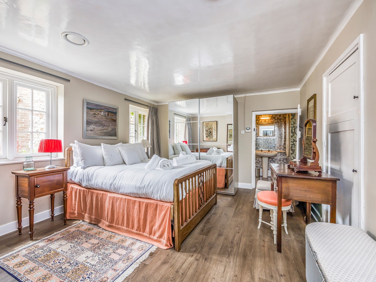 This first floor room, in our self contained guest annexe, has independent access via a door on the drive. It is a large, bright and light double room with a decent sized ensuite shower room and a king size bed. There is a comfortable sofa and a bar/table for eating or working at. There is safe parking for your car on our private drive. There are no cooking facilities but there is a small fridge, kettle and toaster. Basic provisions will be provided so you can make tea, coffee and toast!