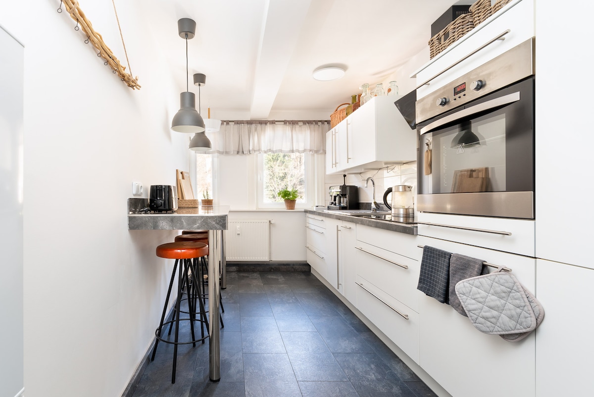 Luminoso apartamento de 3 habitaciones de 65 m² con techos altos. Calle lateral tranquila en una ubicación privilegiada del centro de la ciudad, cerca de Wilhelmsplatz. Cocina totalmente equipada. Cuarto de baño con ducha y WC con ventana. 2 dormitorios con camas dobles (140 x 200 y 160 x 200), uno de ellos con vistas al jardín Adecuado para niños pequeños (cambiador y trona disponibles) El hermoso patio trasero se puede compartir con otros huéspedes. Lavadora y secadora en la casa