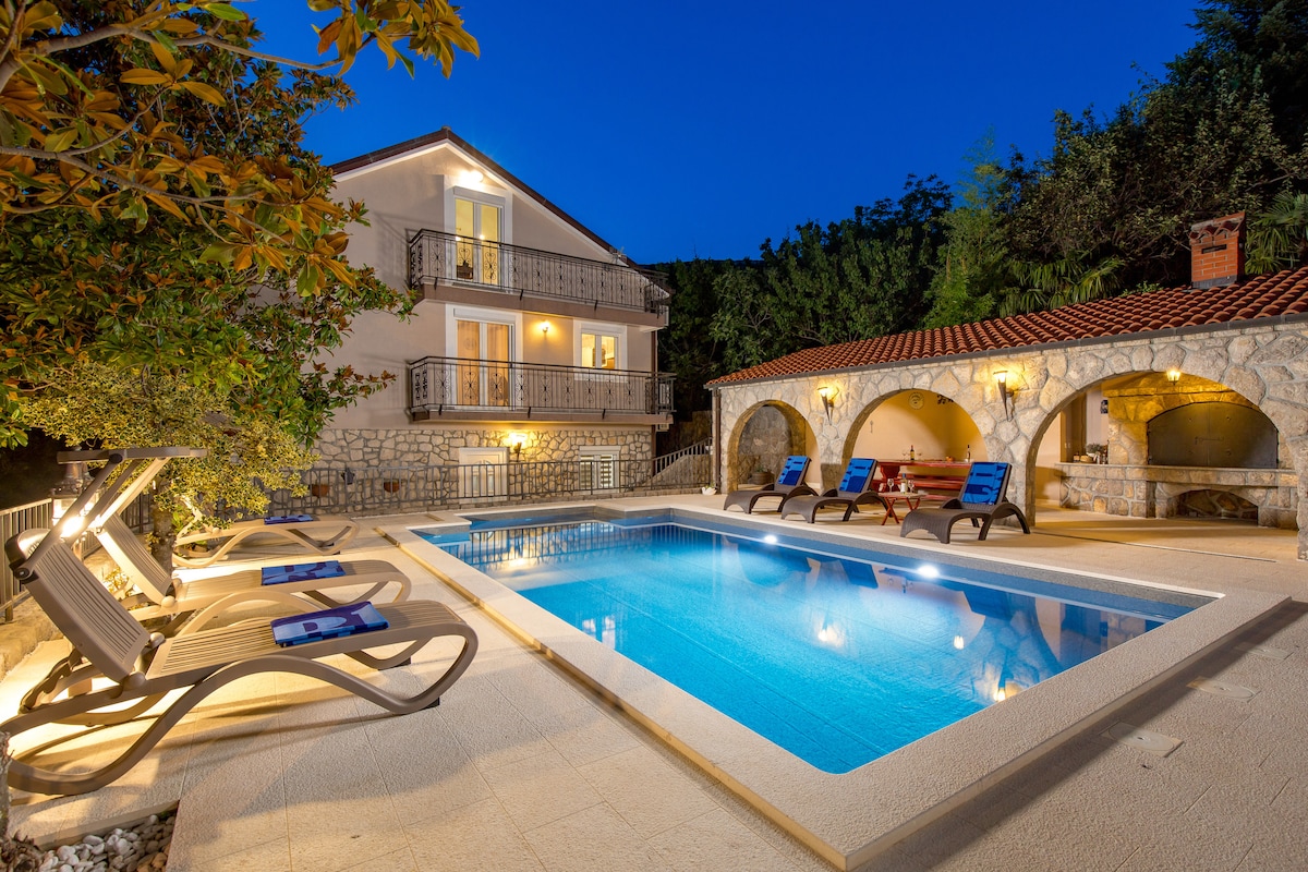 Escape to a private luxury villa surrounded by nature just 5 minutes from Crikvenica. Enjoy a heated pool, outdoor jacuzzi, wine corner and a peaceful garden. Perfect for families or friends looking for privacy near the Adriatic coast. With 4 bedrooms, the villa comfortably accommodates up to 8 guests. Outside, a private pool offers refreshment on hot days and can be heated on request for an additional fee. The sun-lounger area stays shaded most of the day and offers beautiful landscape views.