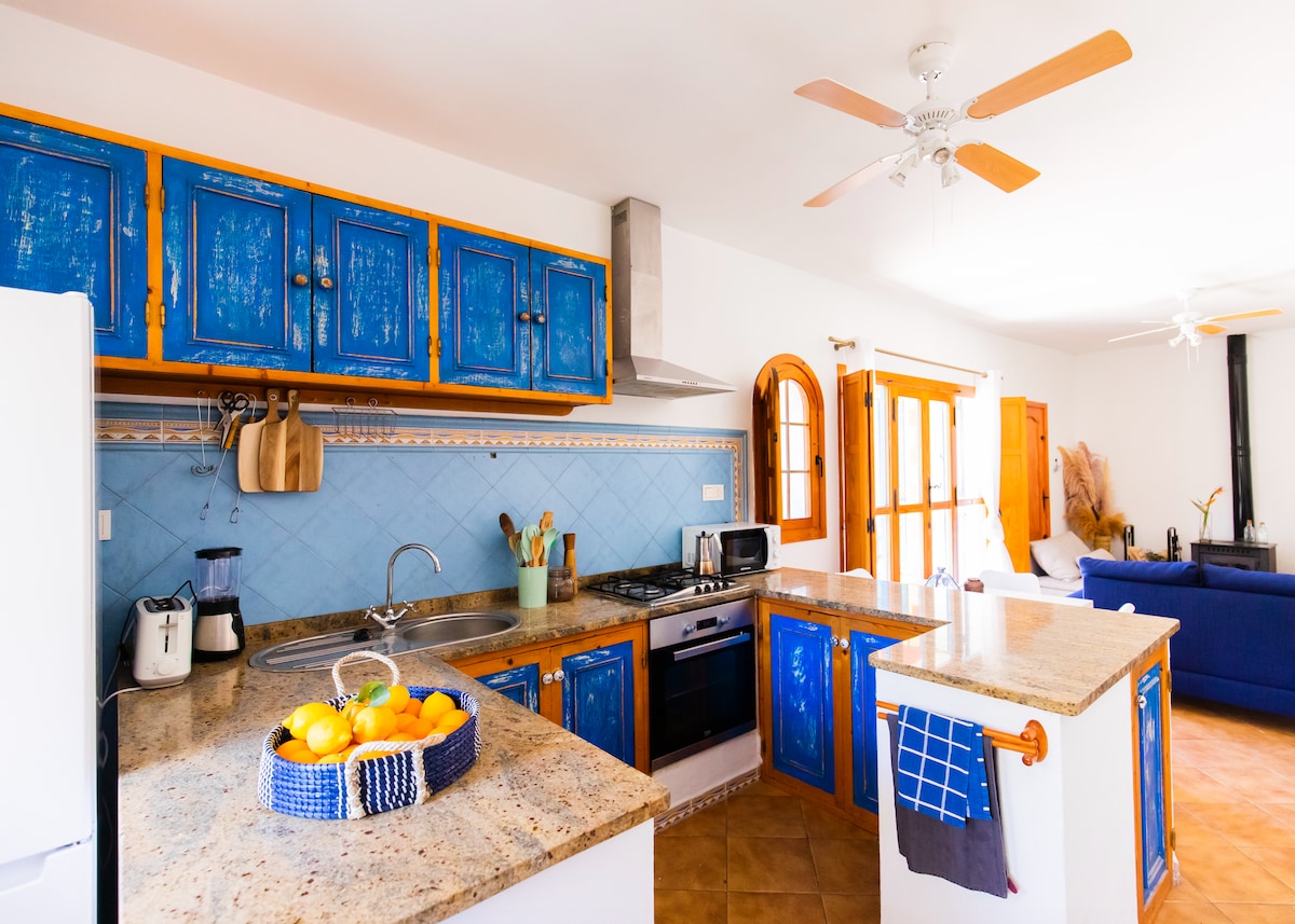 Original Andalucian organic olive tree farm renovated with AC and heating system. The property has an amazing 50sq meters swimming pool with full privacy, a villa with 4 large bedrooms, a 50sq wooden cabin, 2 bathrooms, 5G remote working office, a unique rooftop terrace with 360 mountain view and 2 patios. Seating in a 2500 sq meter fenced eco-garden (ideal for dogs), surrounded by fruit trees. We are located 15 min walk form town. We apply an additional price per guest as of the 5th person.