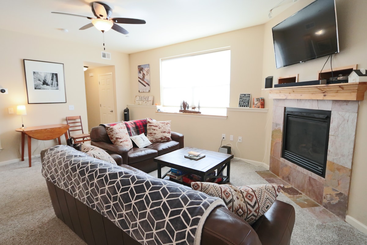 El alquiler vacacional contemporáneo se encuentra en la base de la estación de esquí del parque de invierno. Premier de un dormitorio con cama King. Capacidad para 4 personas. En el tercer piso con acceso a barbacoa, bañera de hidromasaje NUEVA y chimenea. Disfruta de una cocina eficiente con electrodomésticos de acero inoxidable. Auto registro de entrada. Licencia #005596