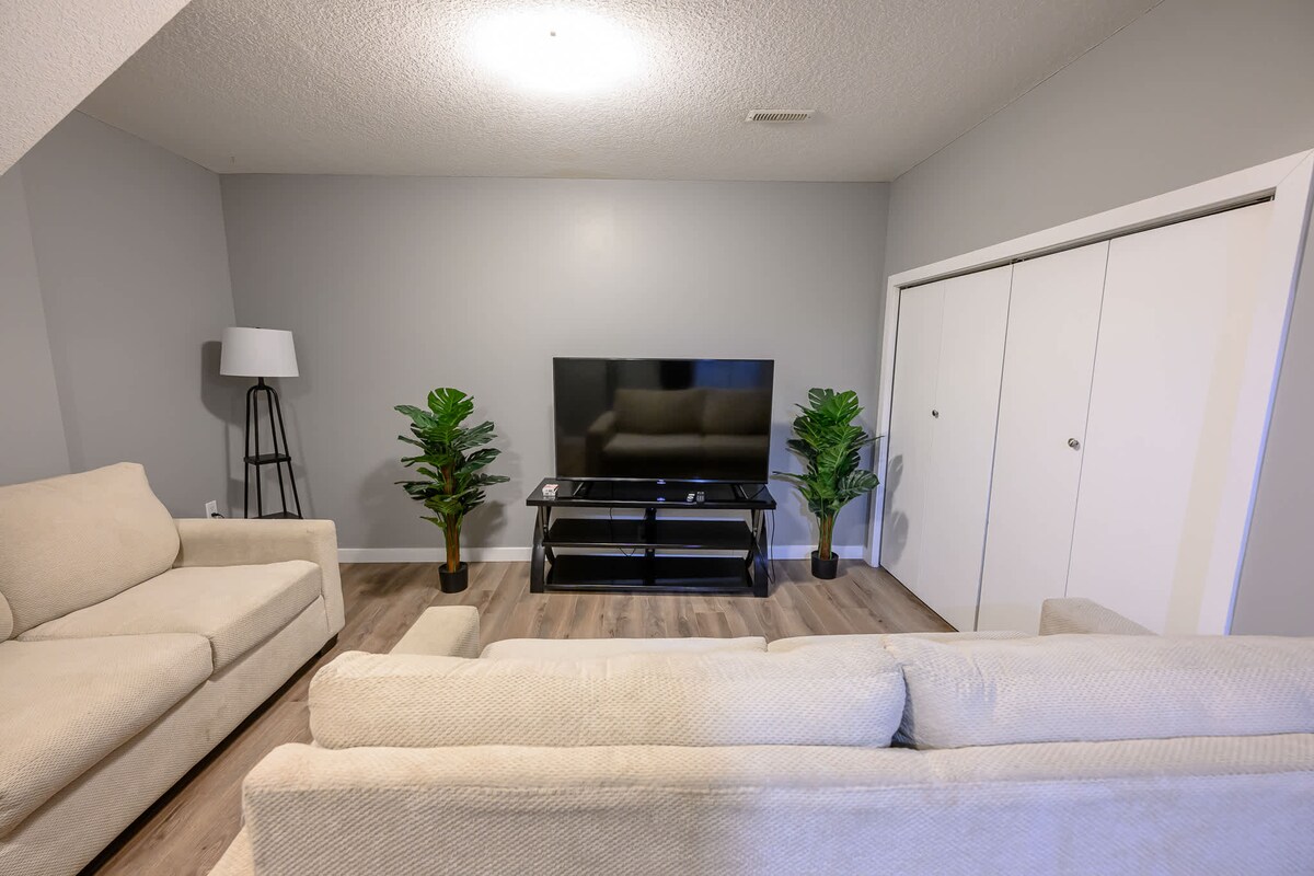 Combate el calor en esta suite privada en el sótano decorada con buen gusto. Dos dormitorios con cómodos colchones, edredones y almohadas. Cocina completa con todo lo necesario para cocinar y comer. Sala de estar con chimenea/calefacción y TV de 55 pulgadas. Baño con ducha amplia. Lavandería compartida en tu nivel. Wifi de alta velocidad ilimitado, canales deportivos, Netflix, Disney + alquiler de películas y Pac-Man. Patio con mesa de comedor y sillas, barbacoa y patio trasero. Barrio tranquilo cerca de senderos para caminar. Aparcamiento gratuito en la calle.