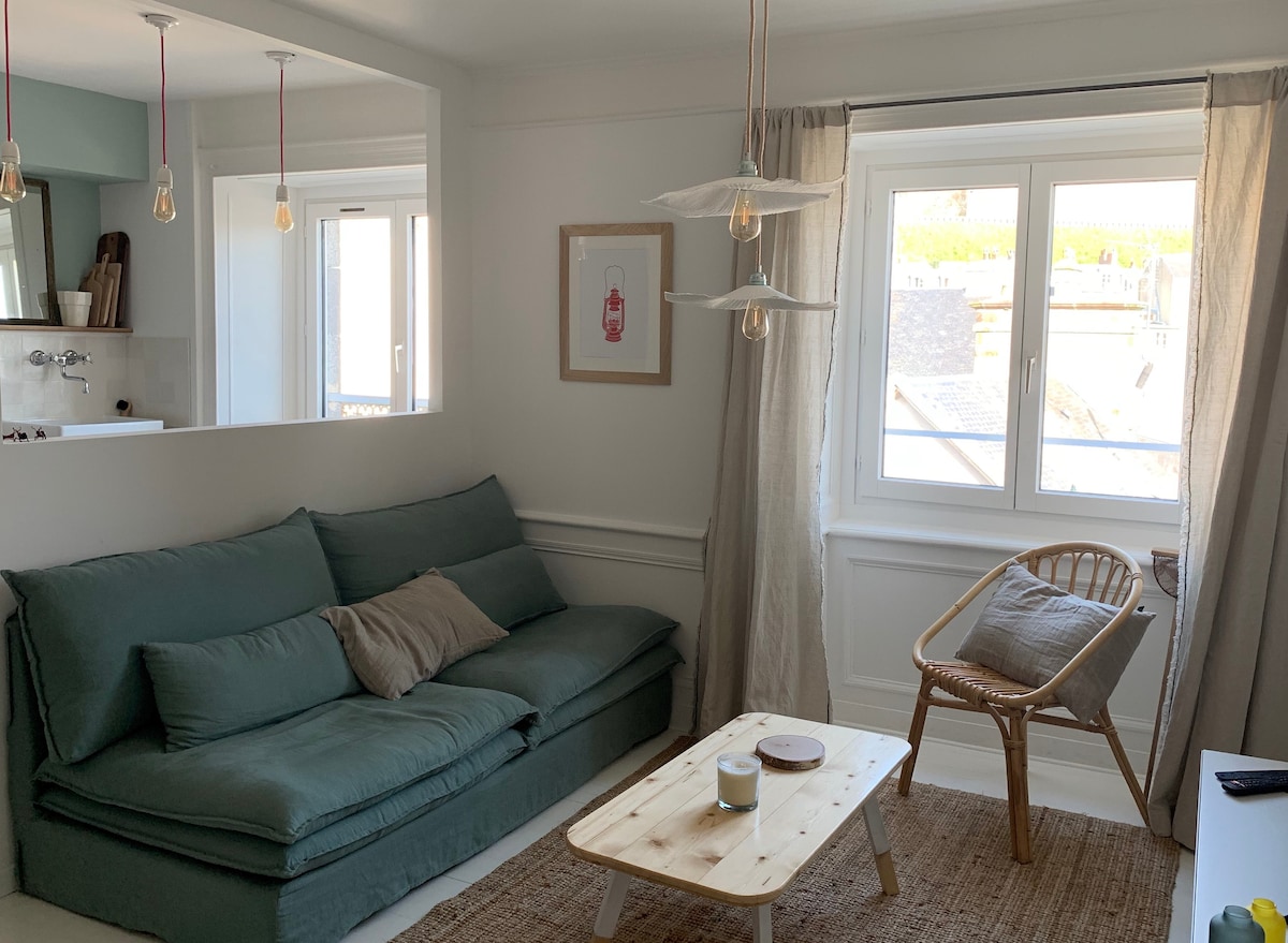 Dúplex con encanto en el primer piso de una antigua casa adosada, a 10 minutos a pie del centro de la ciudad y a 5 minutos a pie de la estación de tren de Granville (París directo en 3 horas desde la estación de Montparnasse). Podrá olvidarse del coche durante su estancia, todo es accesible a pie. Ideal para un viaje a Granville en pareja o en familia. Gran luminosidad transversal. Tendrá acceso a un jardín de flores compartido con el estudio de la planta baja.