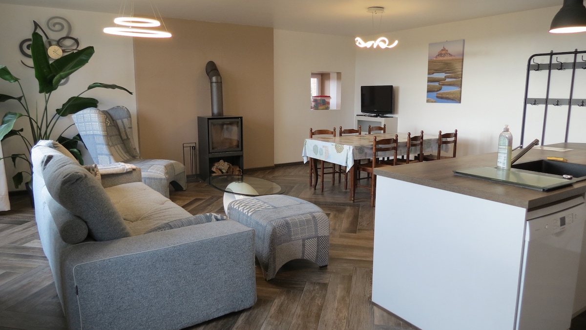 Gîte situé au sein d'un corp de ferme authentique totalement en pierre. Mitoyen de notre maison, idéalement située entre Granville et Avranches Accès simple et rapide -15min de Granville(gare) / Avranches centre -10min des plages de sable de Carolles / Jullouville -45min du Mont st Michel -15min du bec d'Andaine / traversées de la Baie -10min du Zoo de Champrepus Nous élevons et transformons en Agriculture Bio des oies et des produits laitiers de vaches, produits fermiers en vente à la Ferme