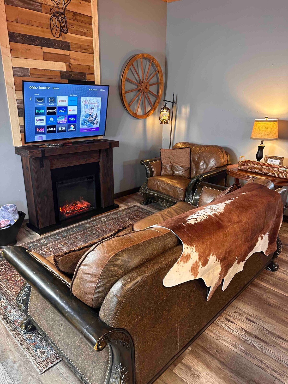 Salón del salvaje oeste con jacuzzi, galerías, chimenea ymucho más