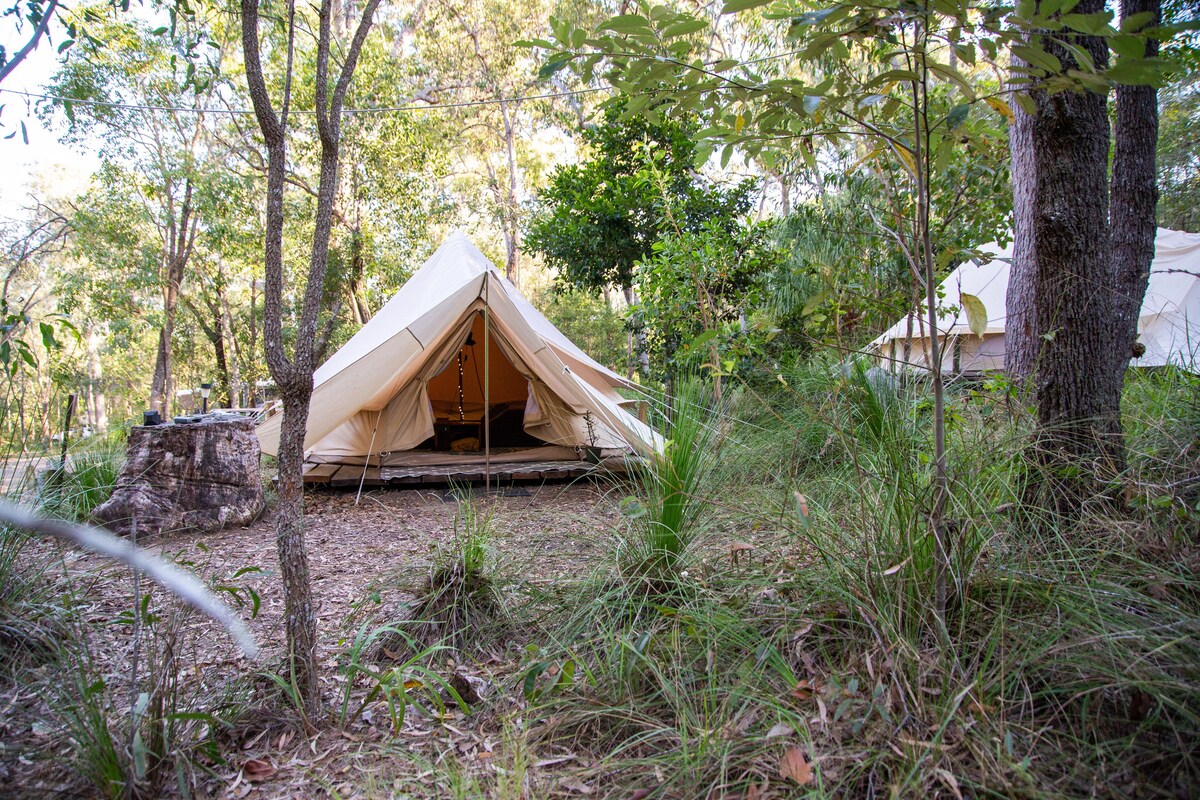 En medio del sereno matorral, nuestra tienda doble ecológica personalizada te espera, con una acogedora cama tamaño queen para dos, ropa de cama fresca, un ventilador de 12v, iluminación LED y carga de teléfono USB. Puedes cargar electrodomésticos de 240v en la cocina del campamento. Esta configuración ofrece comodidad con un presupuesto ajustado, con la logística manejada. Cerca de servicios y cocina, cada tienda de campaña tiene una chimenea. Trae una manta adicional para las noches más frescas; las toallas son BYO.