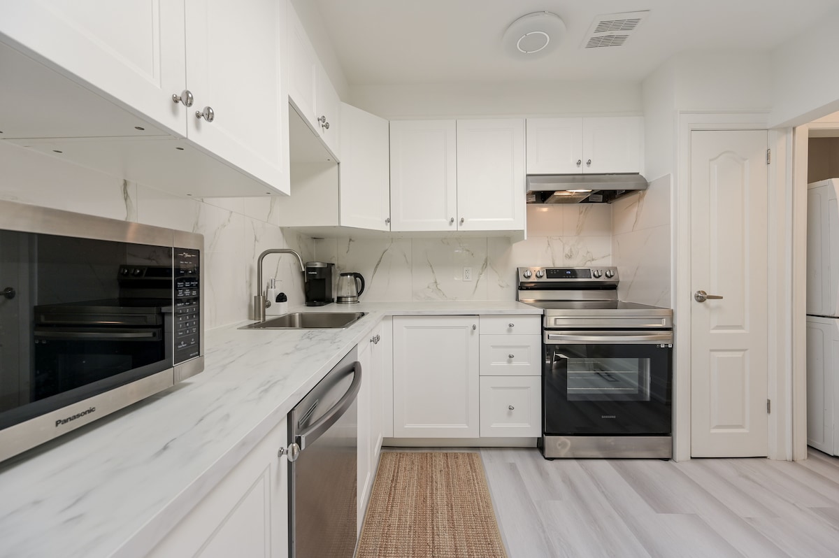 Bienvenido a su acogedor hogar lejos de casa en el corazón de South Etobicoke. Este apartamento luminoso y moderno de 1 dormitorio se encuentra sobre un spa y una clínica tranquilos, y ofrece una estancia tranquila con una comodidad inmejorable. A solo unos pasos de cafeterías, restaurantes, panaderías y parques locales. Disfruta de un rápido viaje de 10 minutos en coche hasta el lago, 15 minutos hasta el centro de Toronto, fácil acceso a la autopista y al transporte público, lo que hace que sea muy fácil llegar a cualquier lugar.