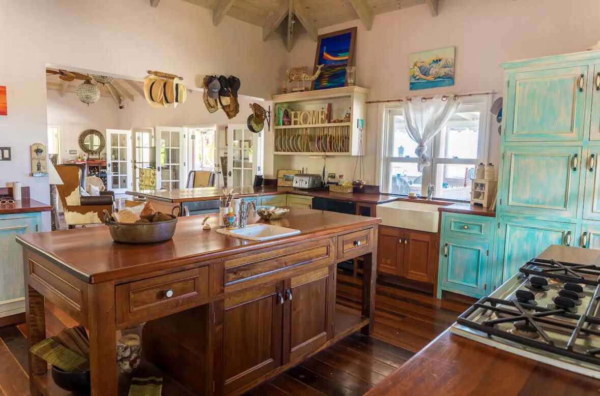 La cabaña de madera con tejas está totalmente fuera de la red. Para llegar a la cabaña hay que caminar un poco a través de un pequeño bosque por un camino estrecho y sinuoso desde la zona de aparcamiento. Construida sobre pilotes, la cabaña tiene vistas a tierras de cultivo y bosques con una larga vista del valle hasta las colinas de English Harbour. La cabaña tiene un dormitorio grande con cama con dosel de madera con mosquitera. Las puertas del granero se abren a un balcón lateral, un baño al aire libre con ducha de agua de lluvia calentada por energía solar y una cocina completa. Maravillosos cielos nocturnos.