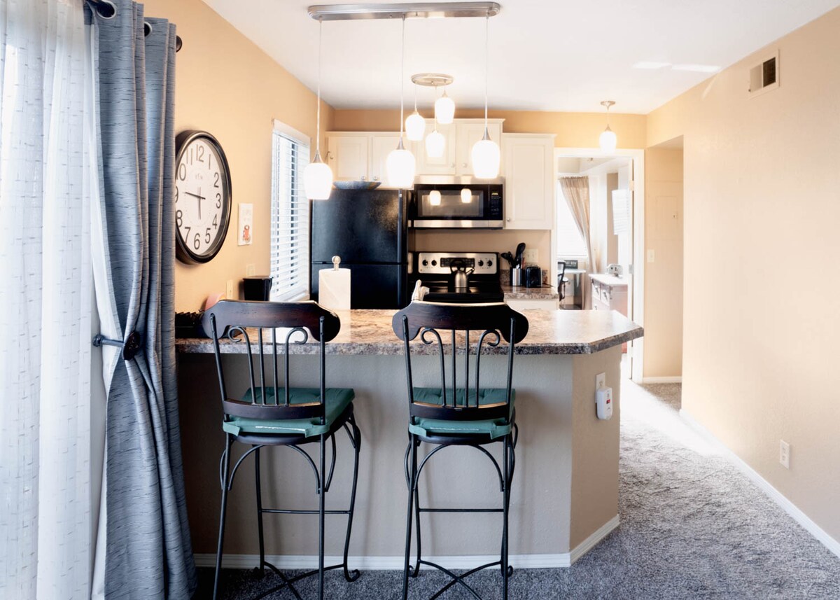 Cómodo, limpio, apartamento de 2 dormitorios y 2 baños recientemente reformado. La unidad está situada en el primer piso y a pocos pasos de la piscina/gimnasio/casa club. Esta acogedora casa se encuentra en el Denver Tech Center y está rodeada de muchos restaurantes y entretenimiento. La unidad cuenta con 1 cama tamaño king/1 cama tamaño queen, vestidores, televisores en los dormitorios y sala de estar con cable y wifi. Lavadora y secadora gratuitas en la unidad para mayor comodidad.