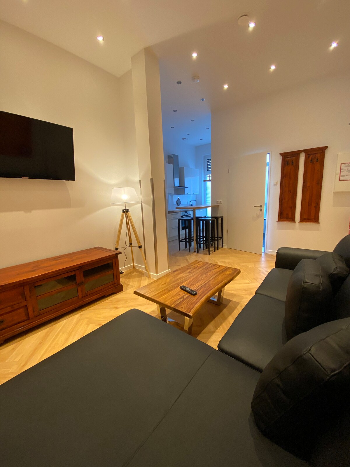 Apartamento nuevo de una habitación, amueblado con buen gusto con terraza privada. Cerca de las comodidades y al transporte público. Con una ubicación ideal entre Berlín y Potsdam. Dormitorio con cama doble grande, colchón cómodo, amplio espacio en el armario y acceso a tu terraza privada aislada. Sala de estar con cómodo sofá en forma de L, que se convierte en otra cama doble, TV y reproductor de DVD, así como espacio para comer con capacidad para cuatro personas. Cocina abierta, bien equipada con nevera/congelador, vitrocerámica, horno y lavavajillas.