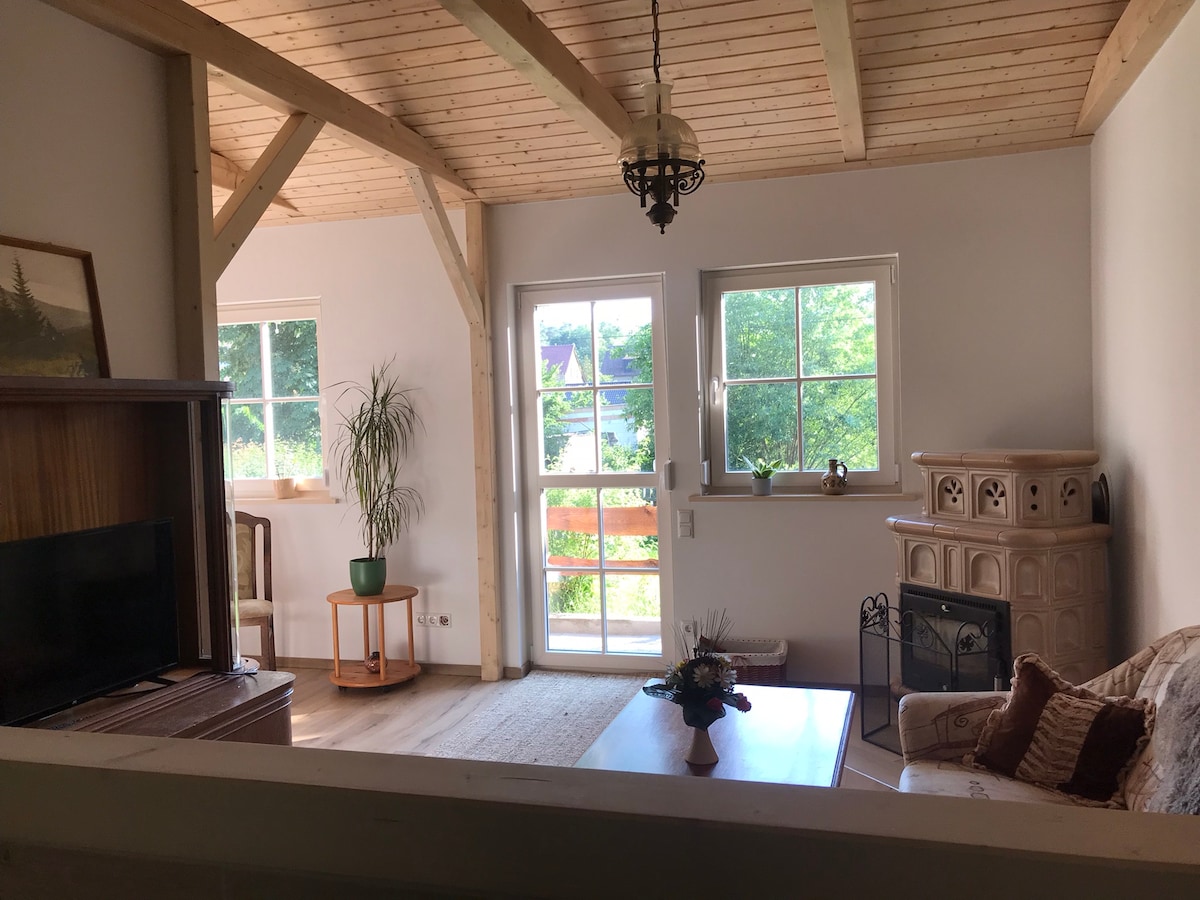 Casa diseñada con cariño, con su propia entrada y zona de jardín, ubicada en una zona tranquila y rodeada de naturaleza. En unos 70 m², encontrarás dos dormitorios con camas dobles, un baño con bañera y ducha, y una acogedora sala de estar con zona de comedor. La moderna cocina está totalmente equipada con horno, lavavajillas y nevera, ideal para parejas, familias o personas que buscan tranquilidad.